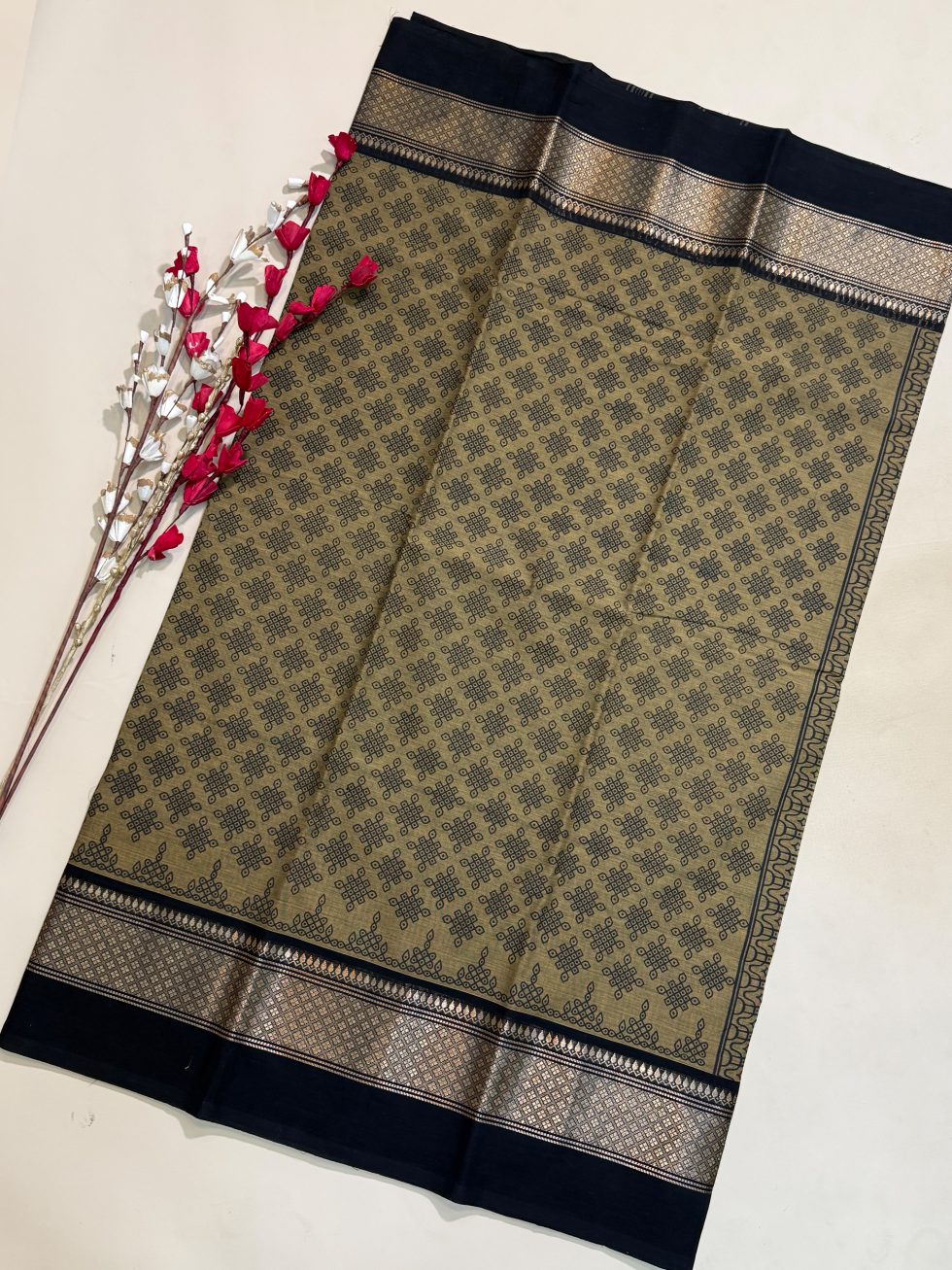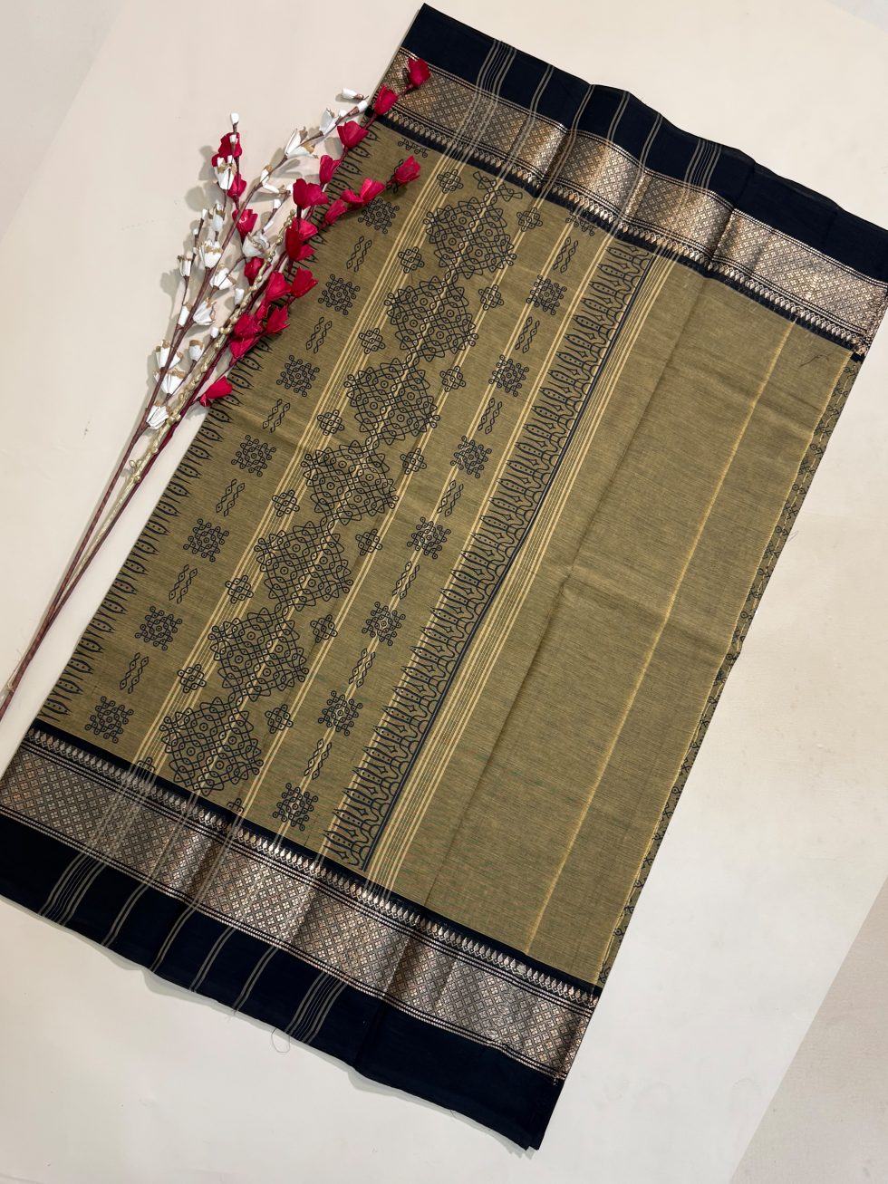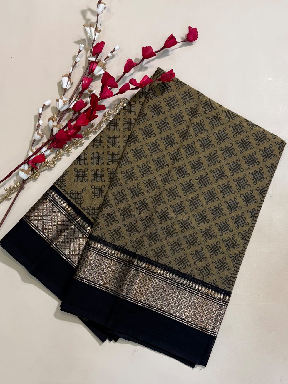 Chettinad Cotton Hand Block Prints in Dual Shaded Beige And Black With Traditional Border