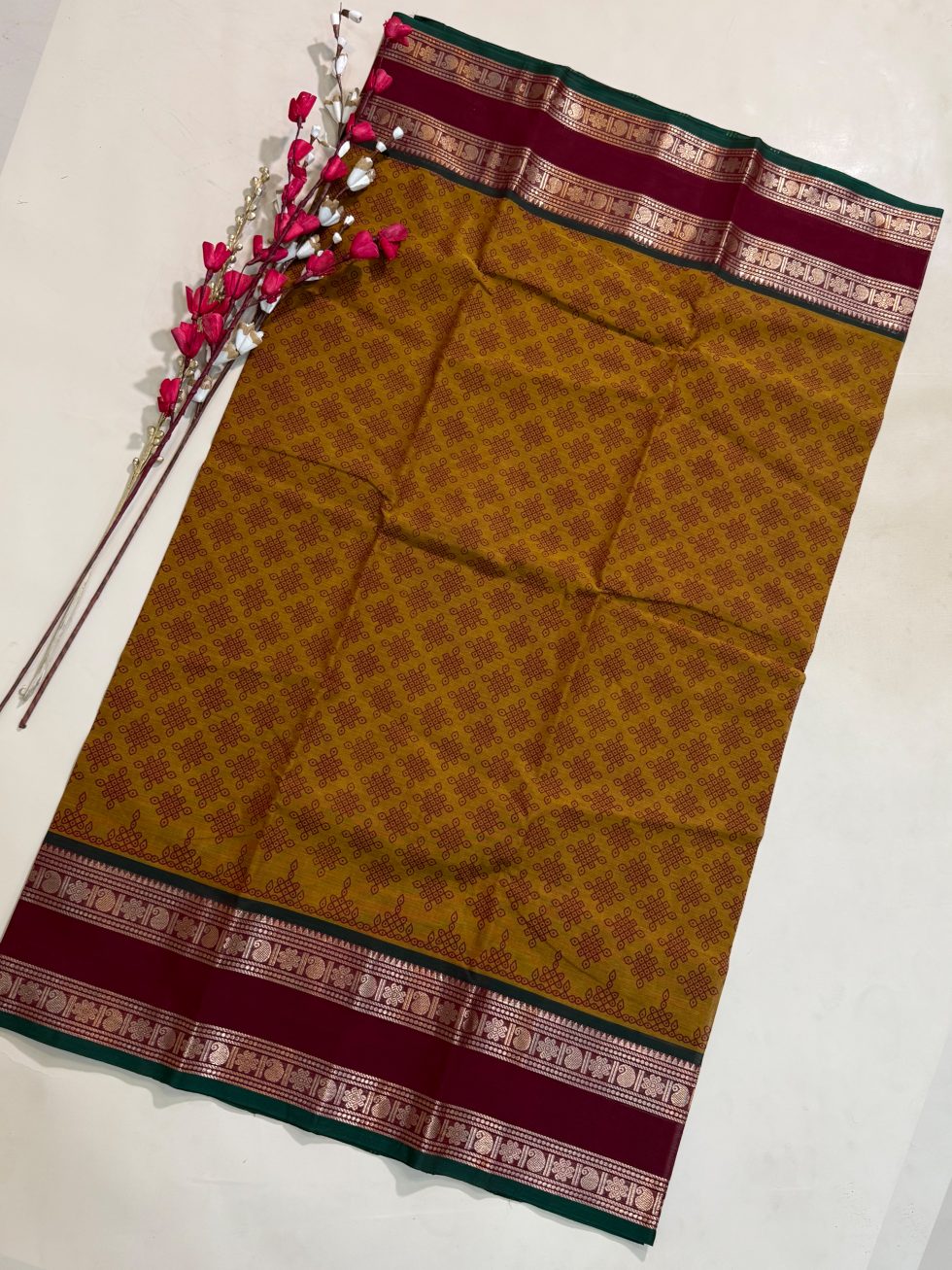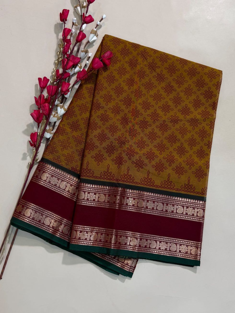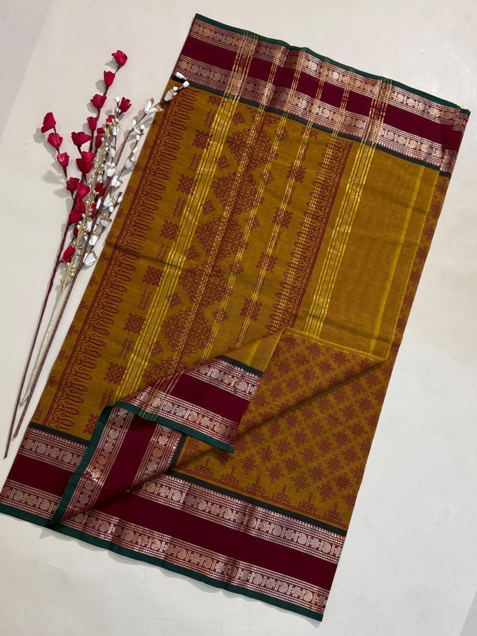Chettinad Cotton Hand Block Prints in Dual Shaded Mustard And Maroon With Traditional Border
