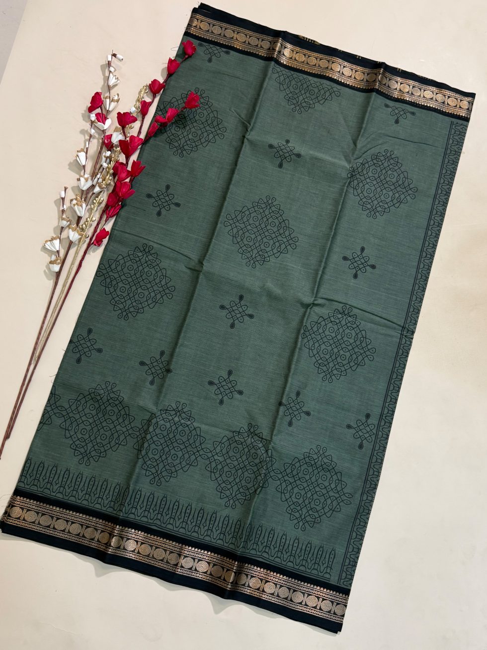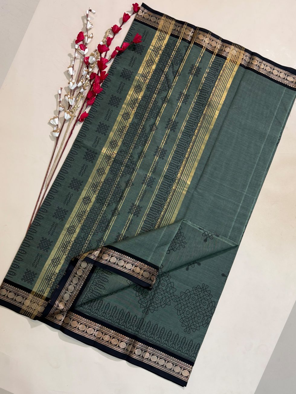 Chettinad Cotton Hand Block Prints in Dual Shaded Pastel Green And Black With Traditional Border