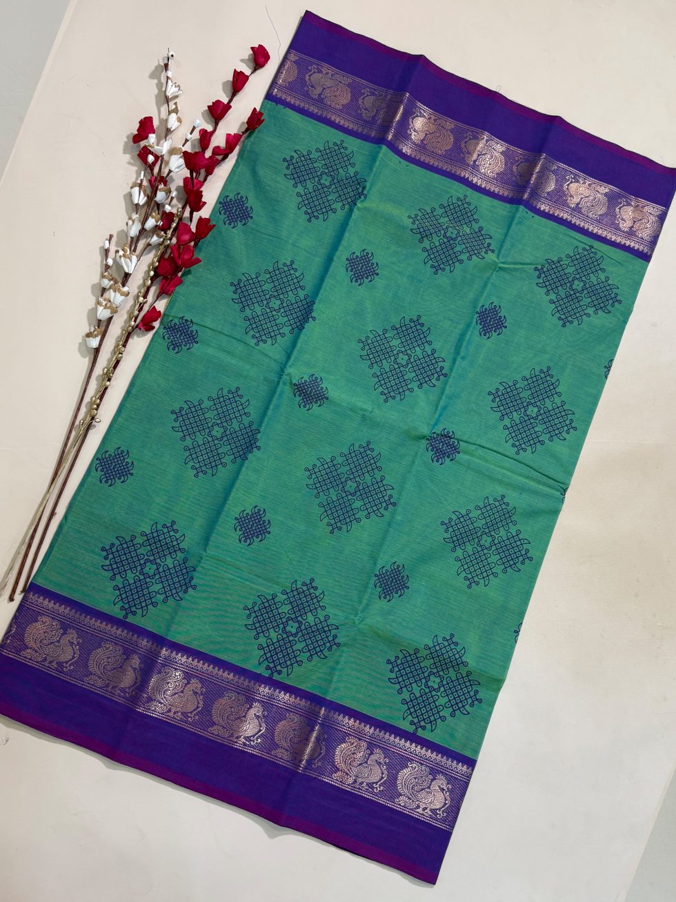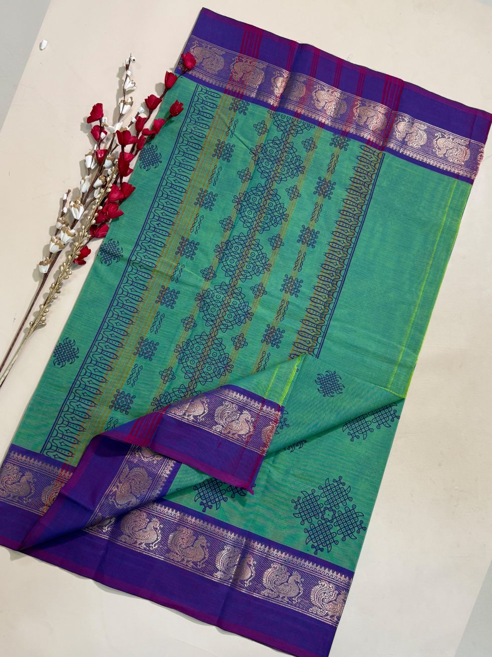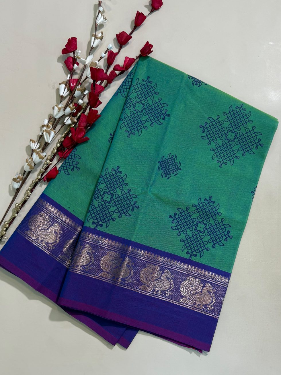 Chettinad Cotton Hand Block Prints in Teal And Dual Shaded Magentha With Traditional Border
