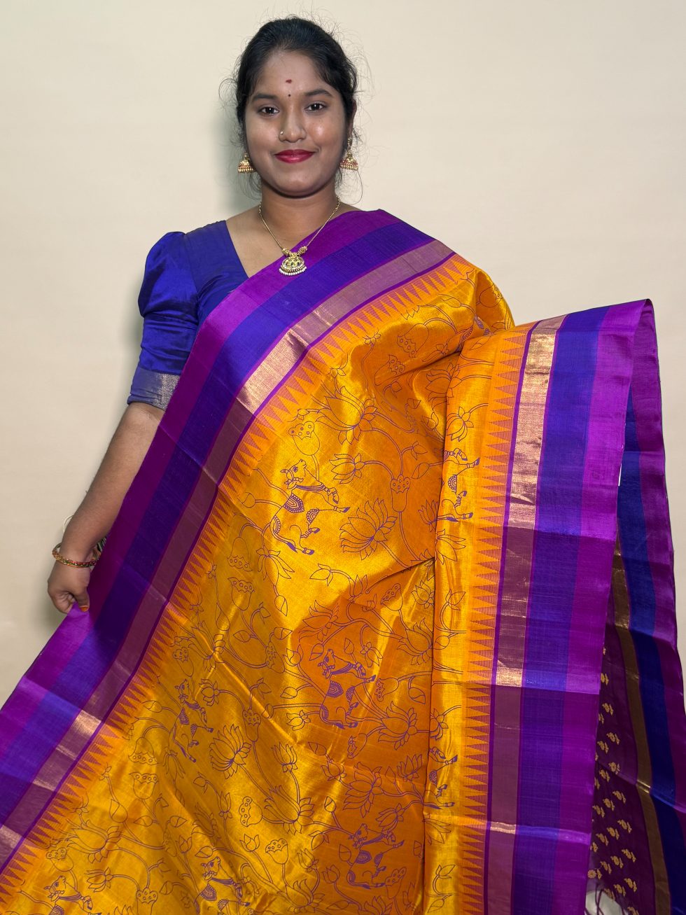 Kuppadam Silk Cotton Kalamkari Prints in Sunset Orange And Magentha With Traditional Border