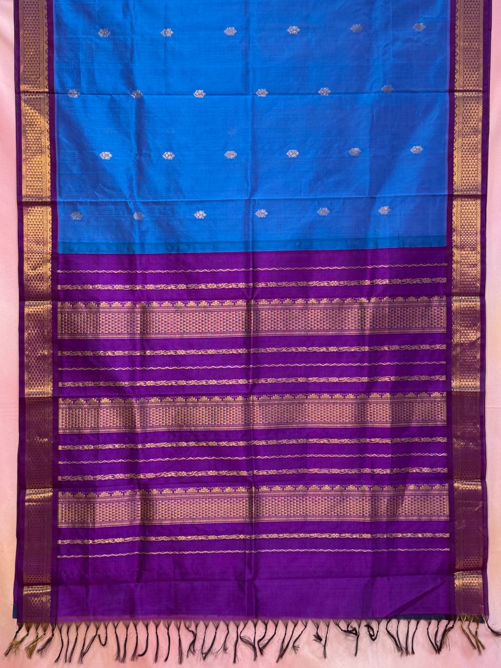 Madisar Korvai Silk Cotton Buttas Saree In Anandha Blue And Purple With Traditional Border