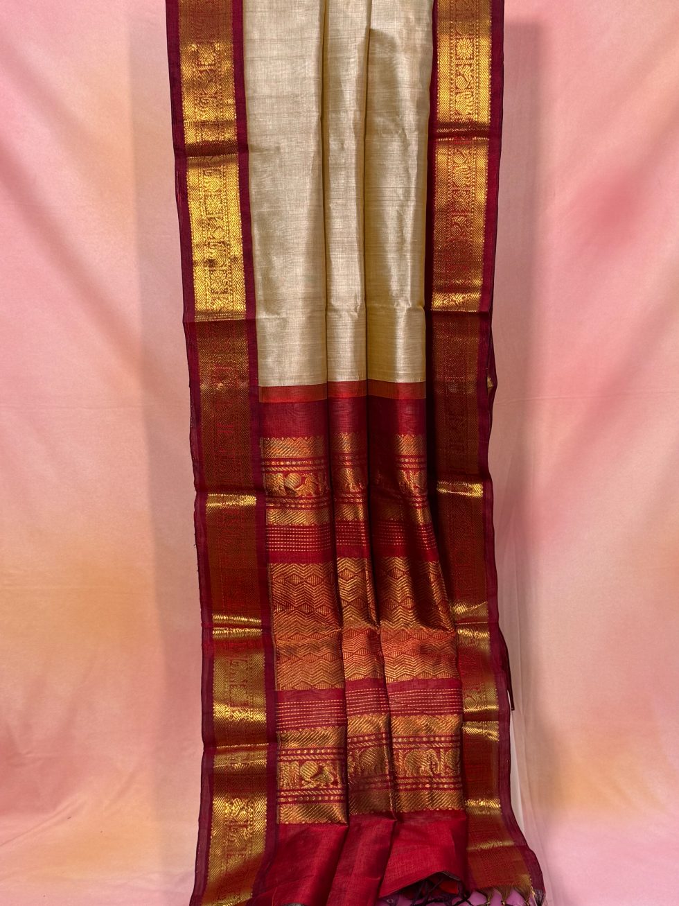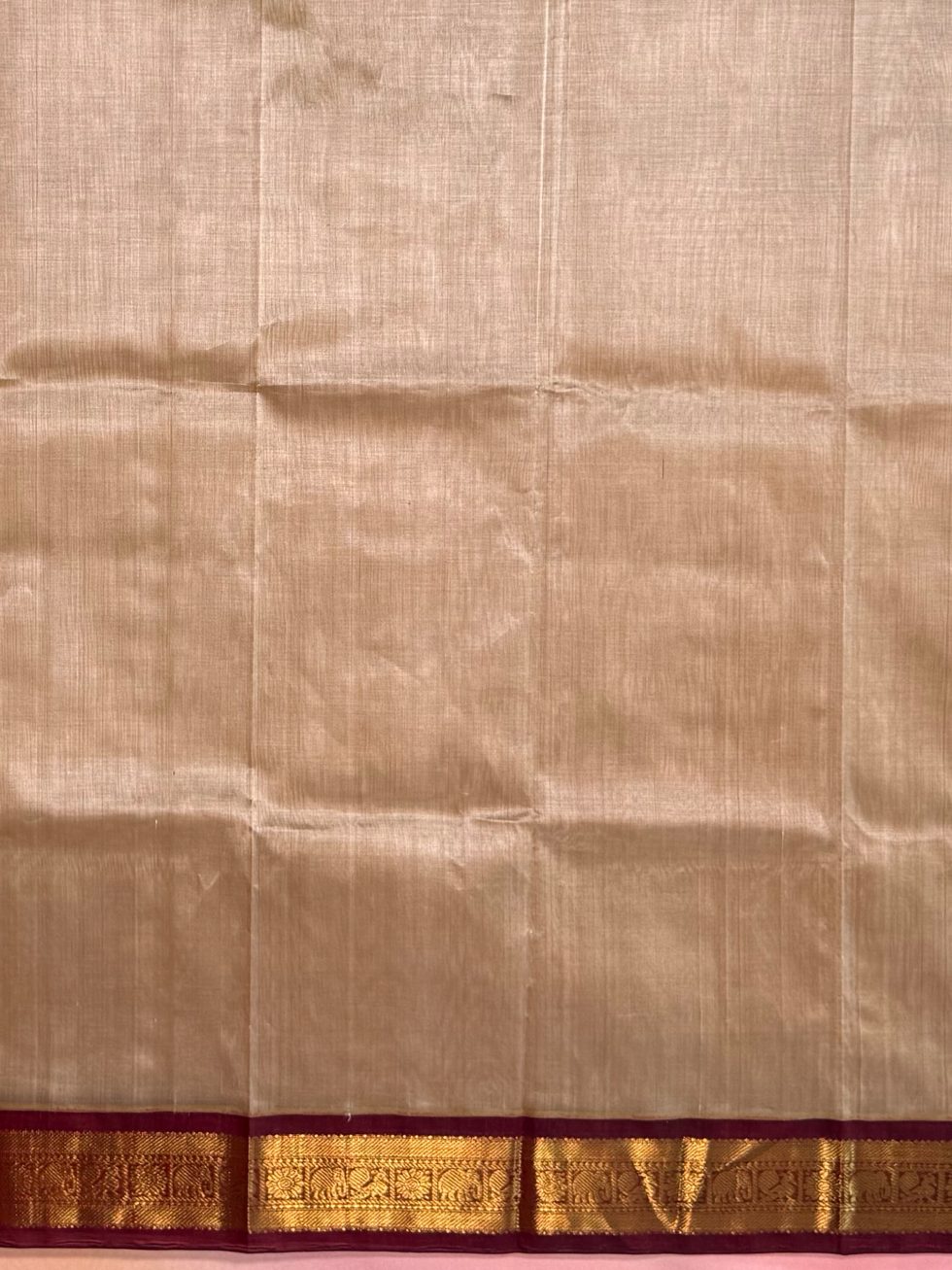Madisar Korvai Silk Cotton Saree In Beige And Maroon With Traditional Border