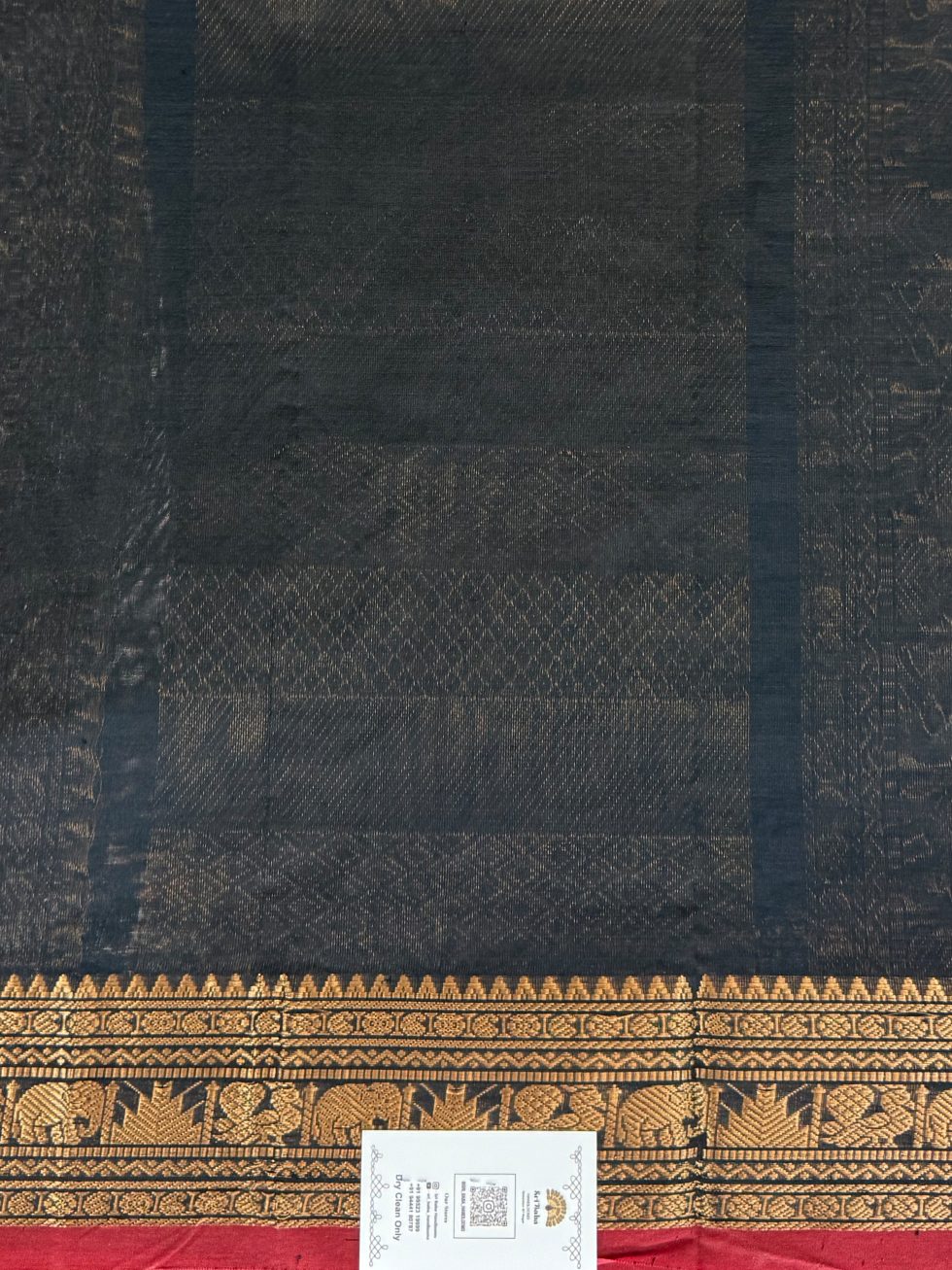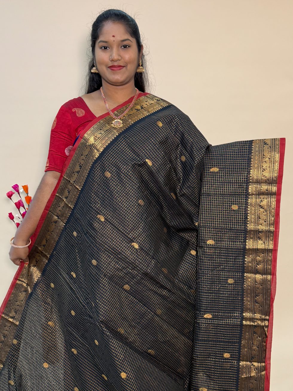 Mangalgiri Silk Cotton Checked Buttas In Black With Traditional Border