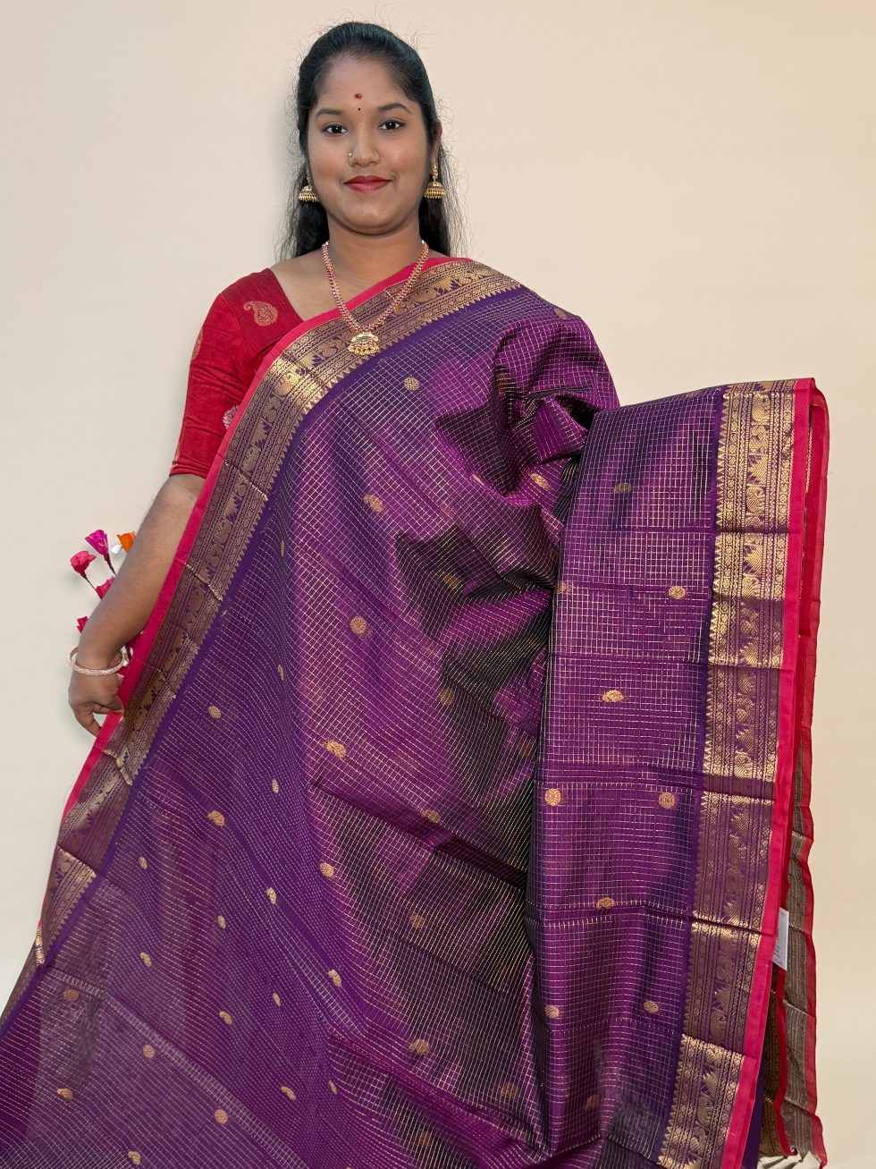 Mangalgiri Silk Cotton Checked Buttas In Wine With Traditional Border