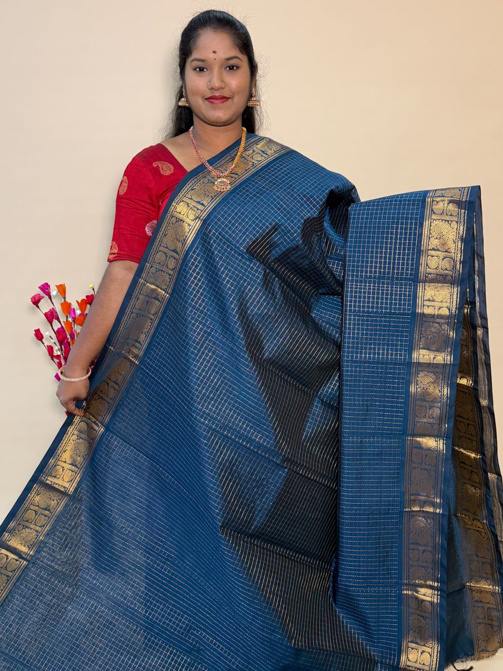 Mangalgiri Silk Cotton Checked Saree In Peacock Blue With Traditional Border