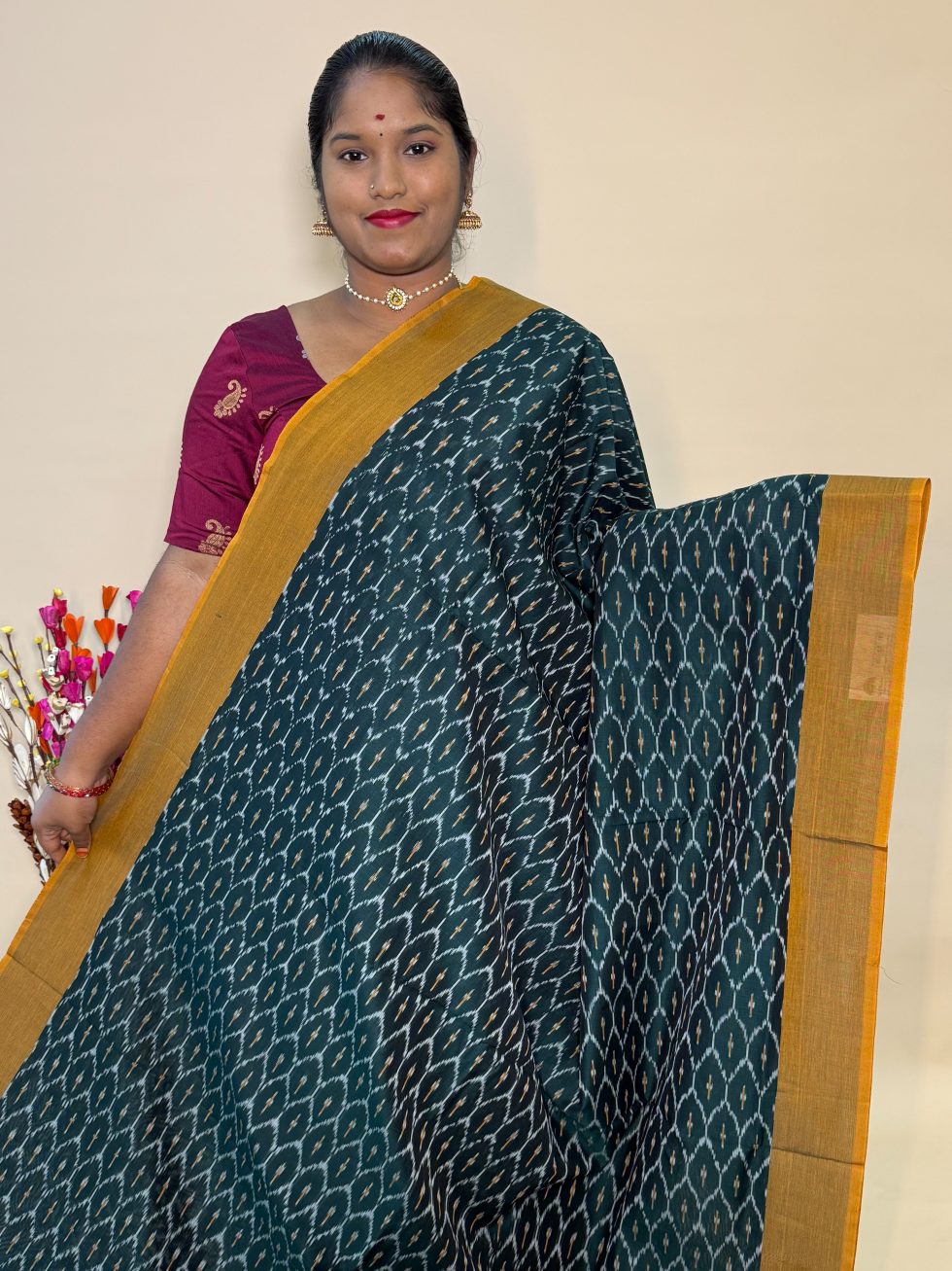 Mercerised Ikkat Cotton Saree In Bottle Green And Dual Shaded Mustard With Allover Ikkat Weaves
