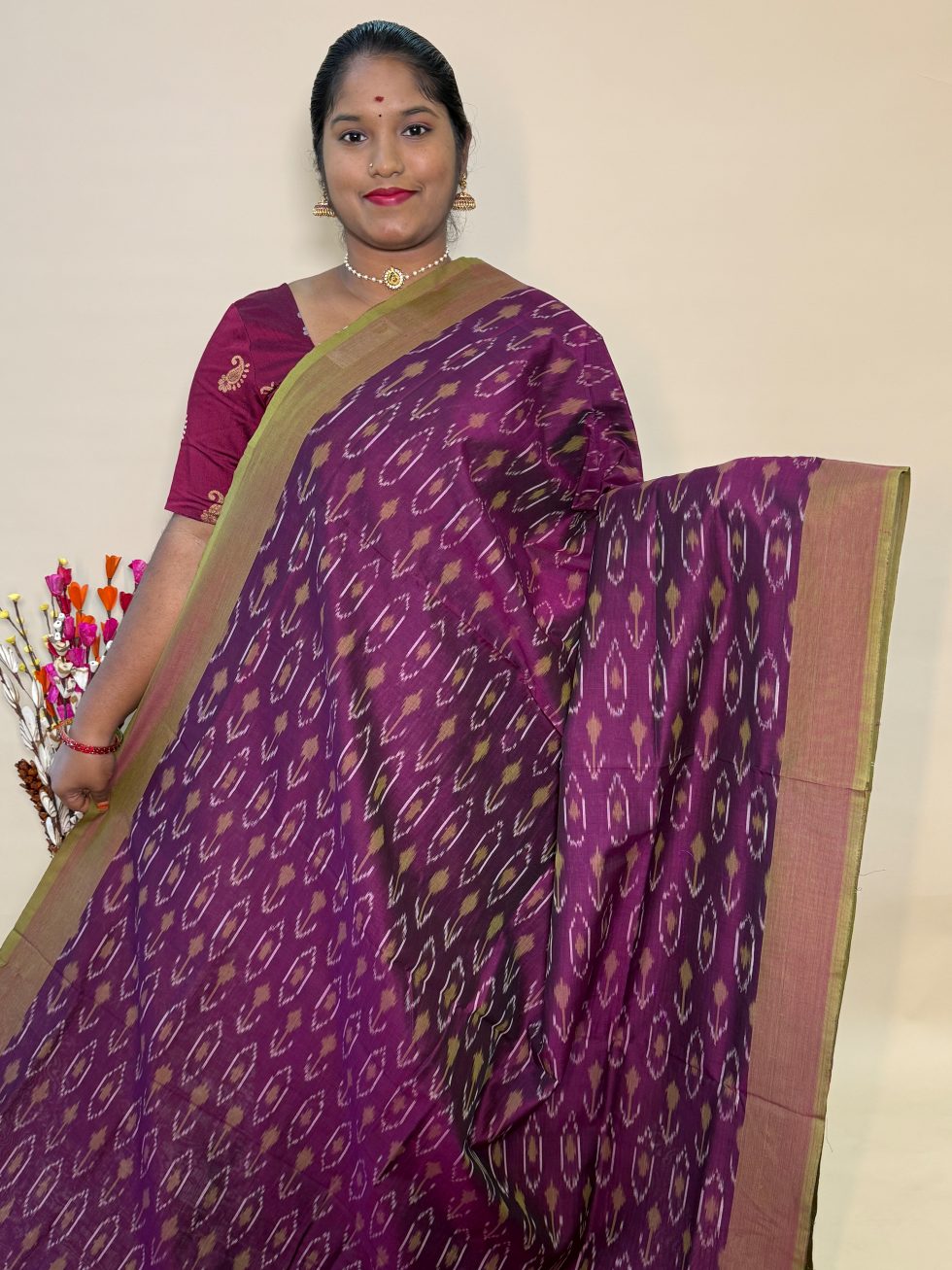 Mercerised Ikkat Cotton Saree In Magentha And Dual Shaded Olive Green With Allover Ikkat Weaves