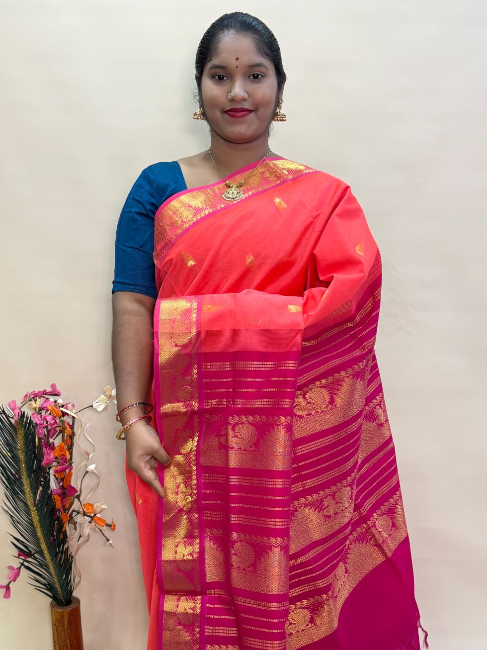 Semi Silk Cotton Buttas In Peach And Dark Pink With Traditional Border
