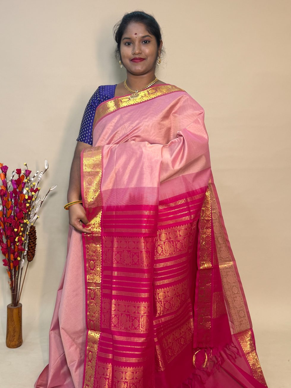 Semi Silk Cotton Plain In Pastel Pink And Pink With Traditional Border