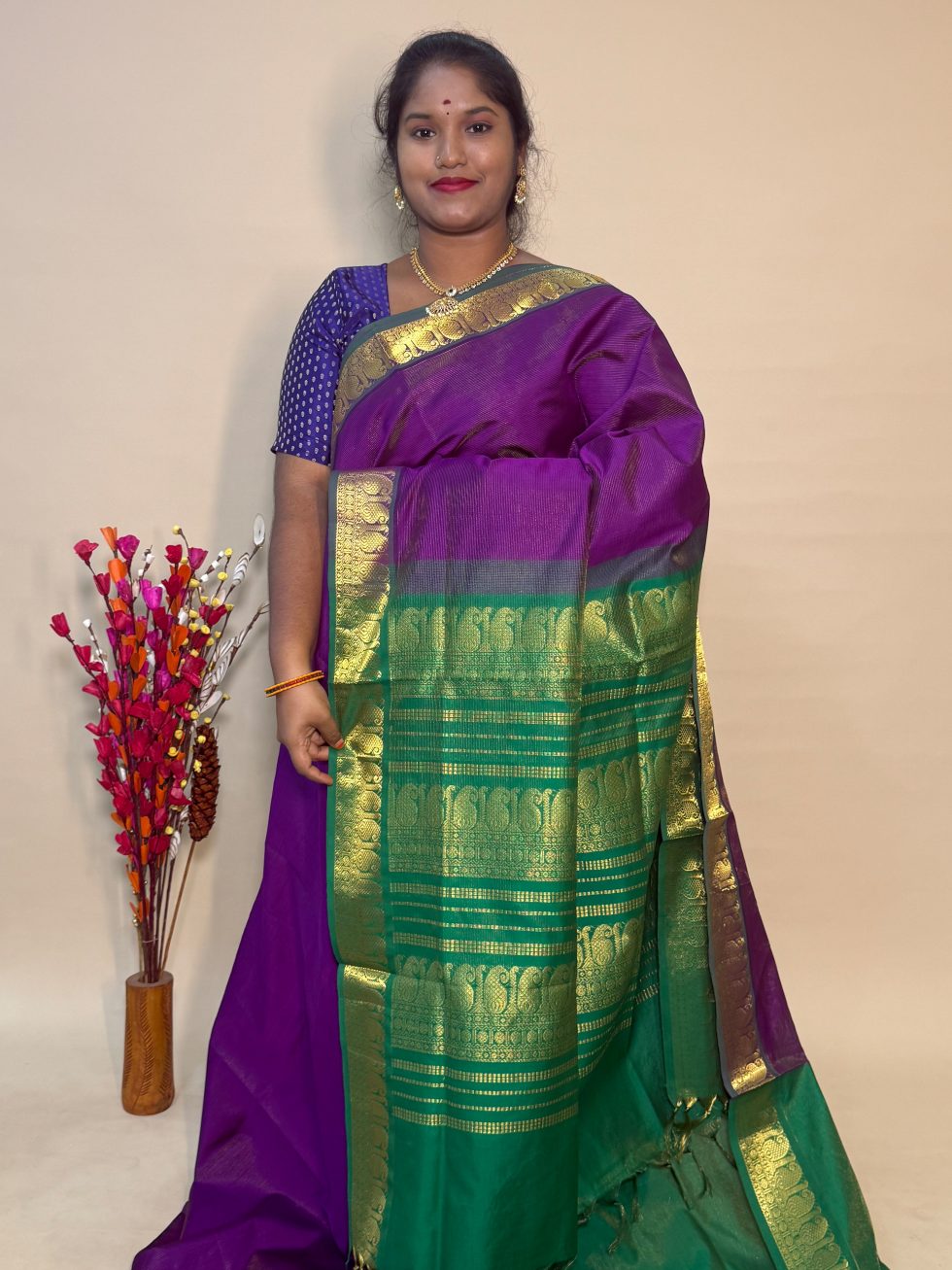 Semi Silk Cotton Vairaoosi In Magentha And Green With Traditional Border