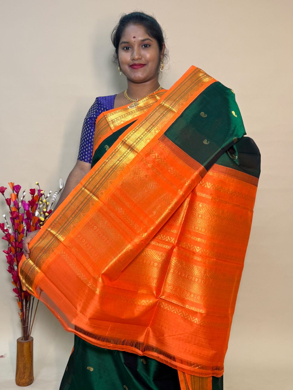 Silk Cotton Korvai Buttas In Green And Orange With Traditional Border