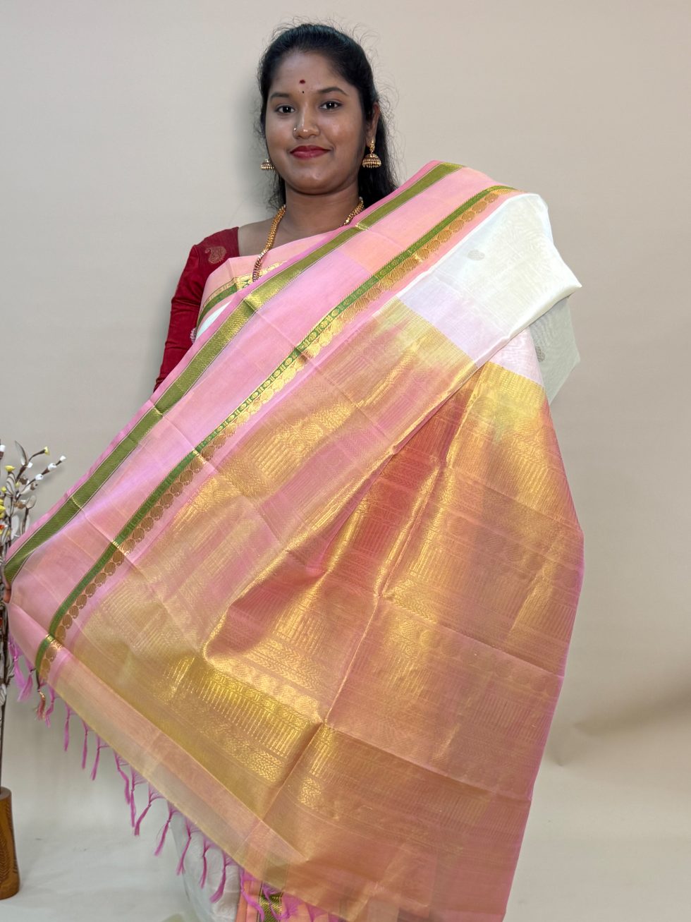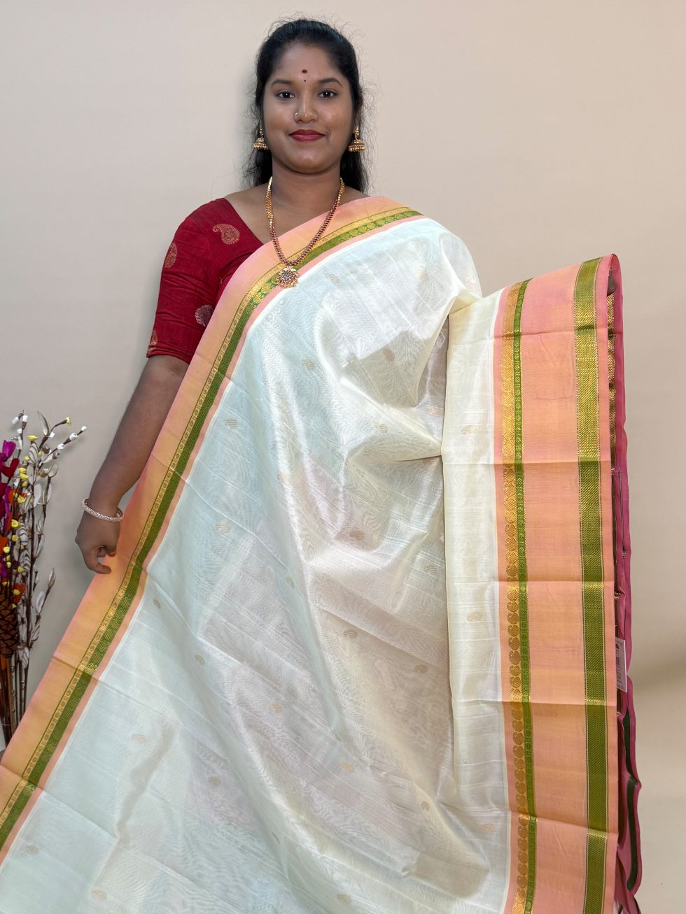 Silk Cotton Korvai Buttas In Half White And Peach With Traditional Border