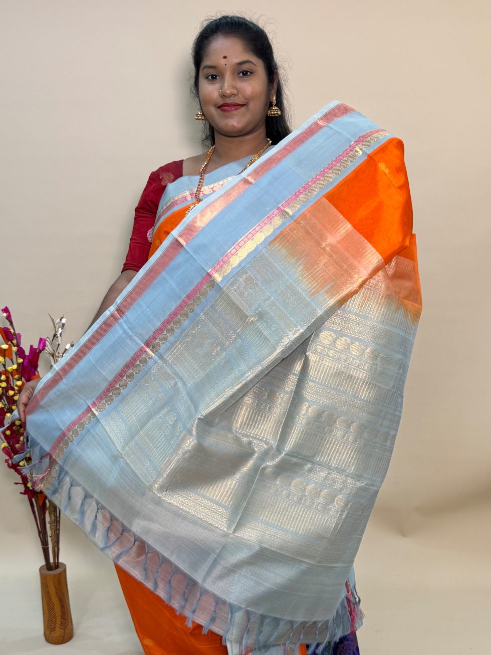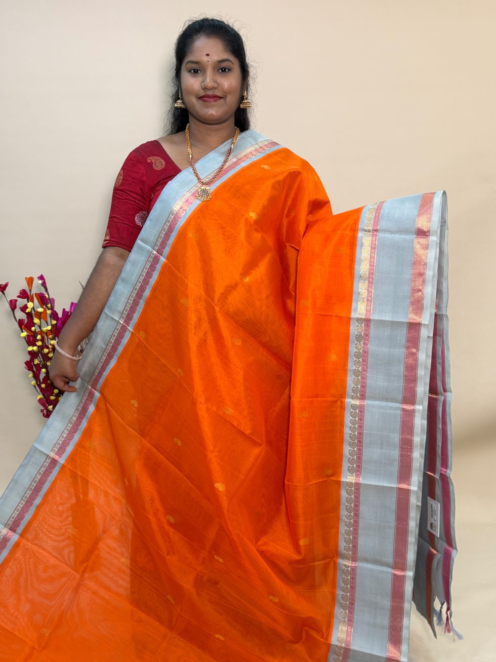 Silk Cotton Korvai Buttas In Orange And Silver Grey With Traditional Border