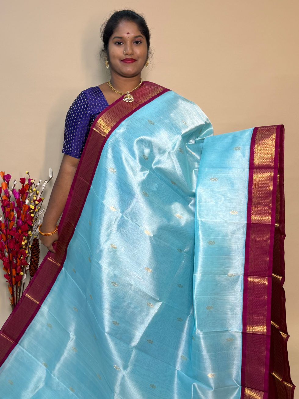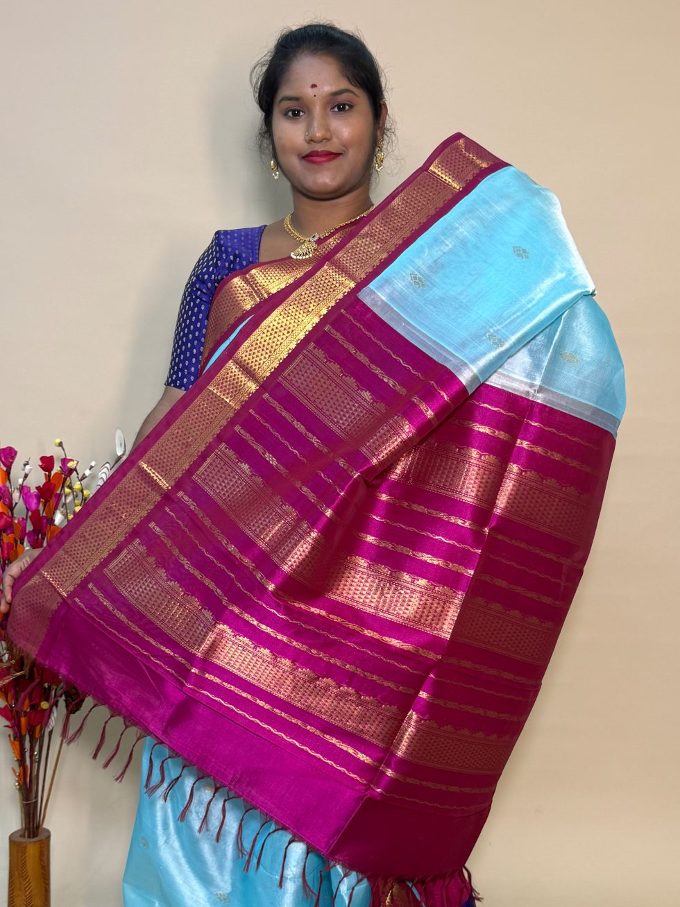 Silk Cotton Korvai Buttas In Powder Blue And Vadamalli With Traditional Border