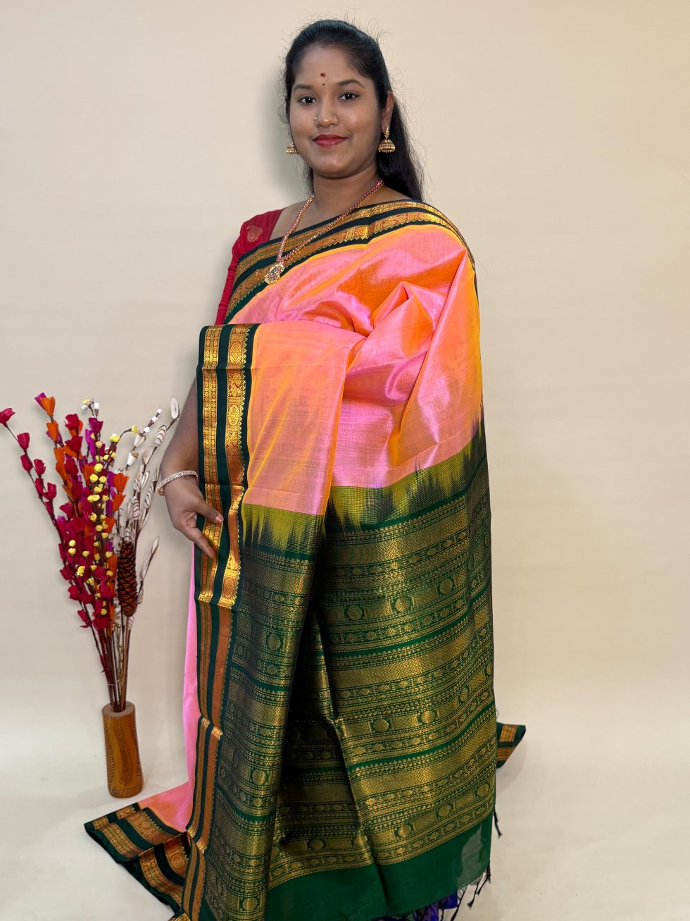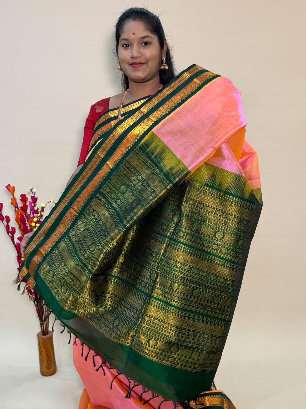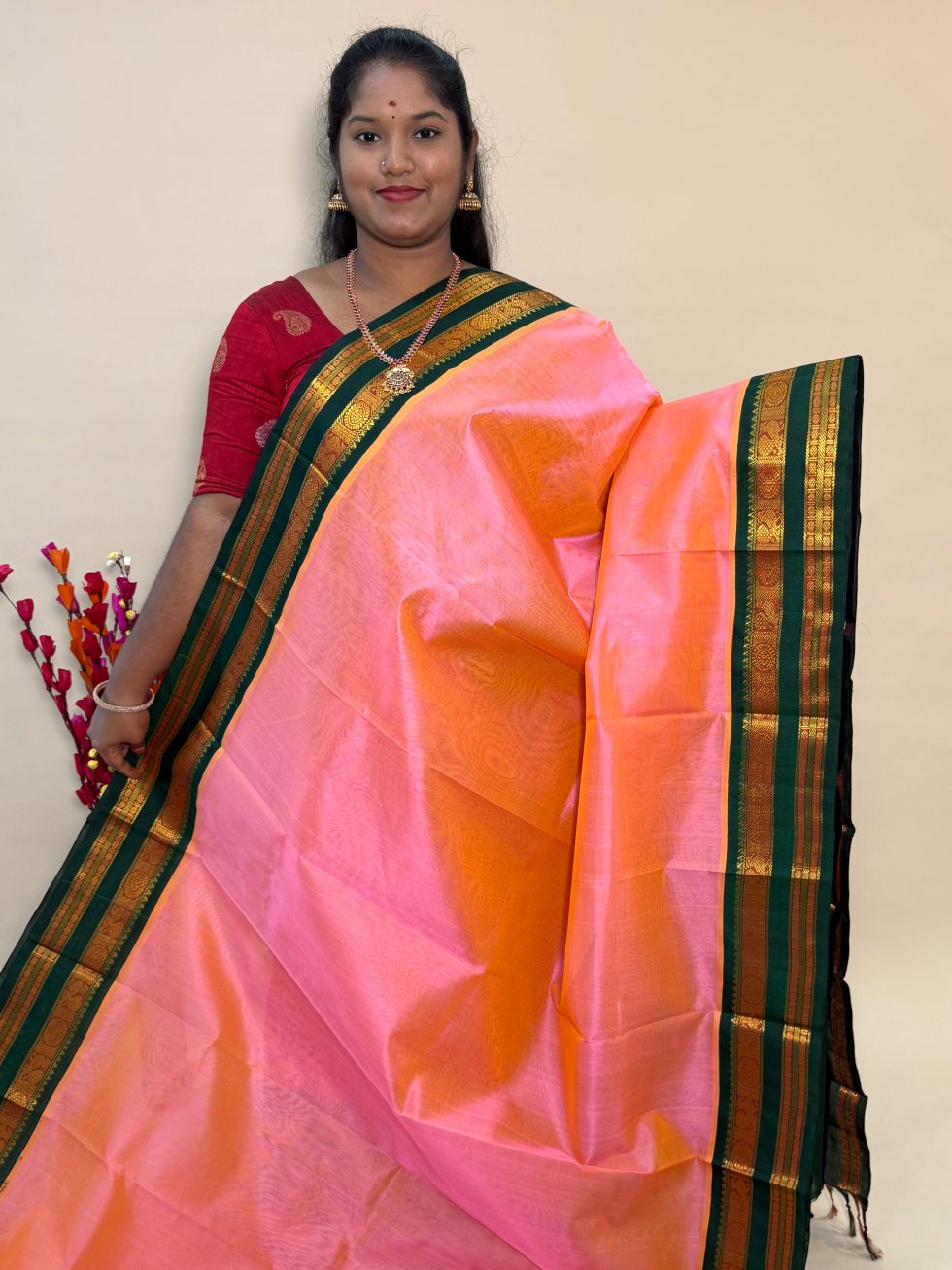 Silk Cotton Korvai in Dual Shaded Pink And Green With Traditional Border