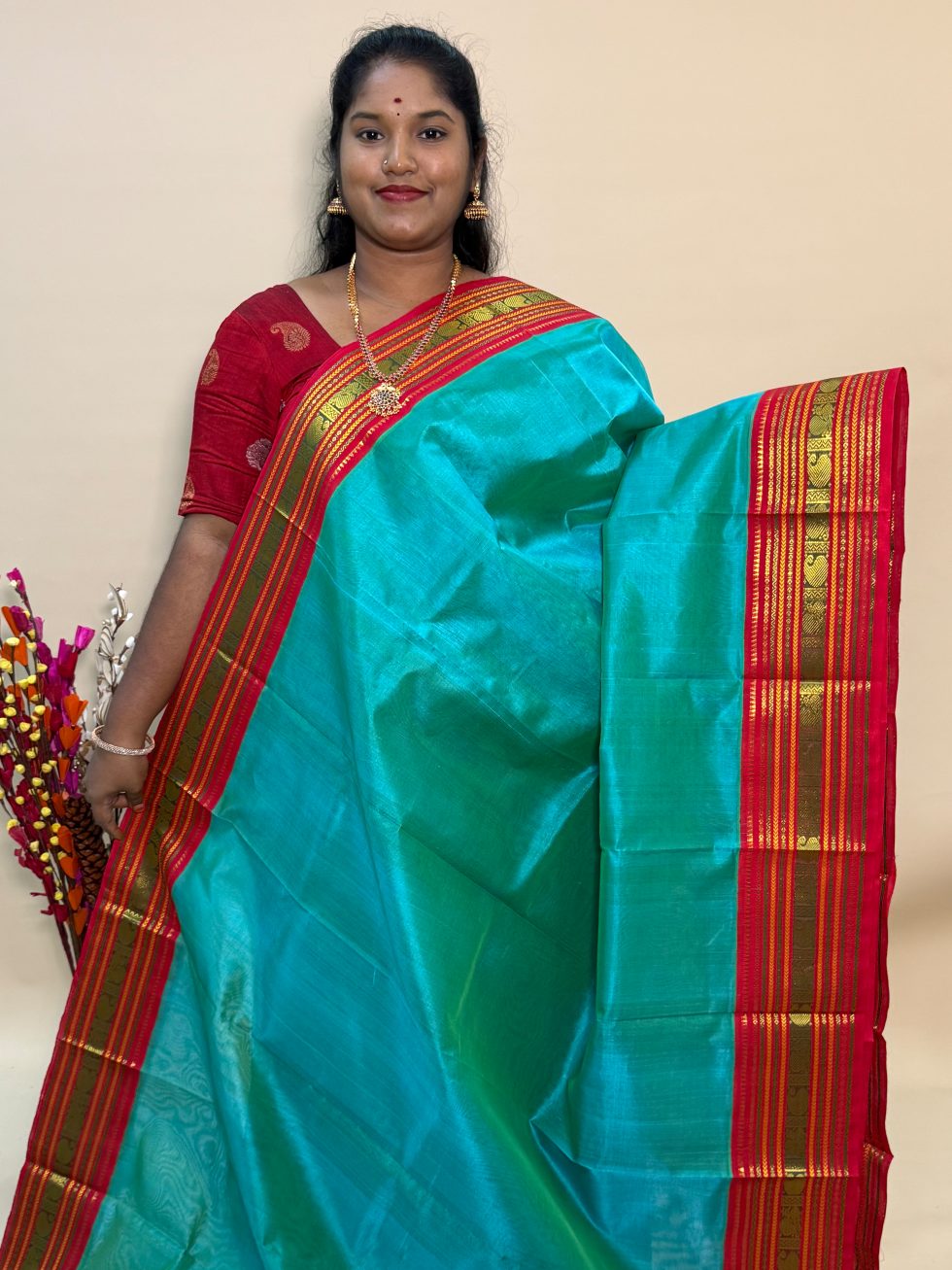 Silk Cotton Korvai in Dual shaded Teal And Red With Traditional Border