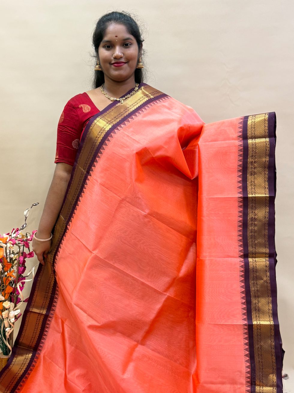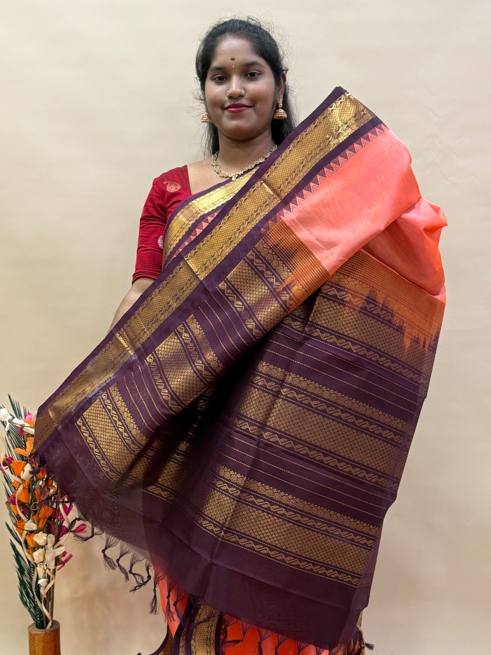 Silk Cotton Korvai in Pastel Orange And Brown With Traditional Border