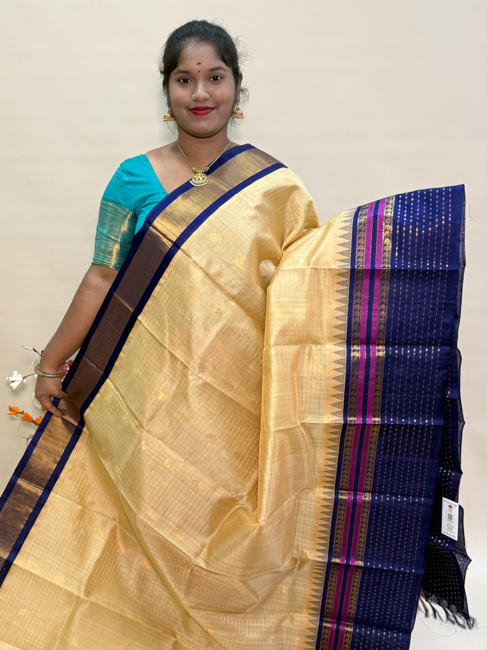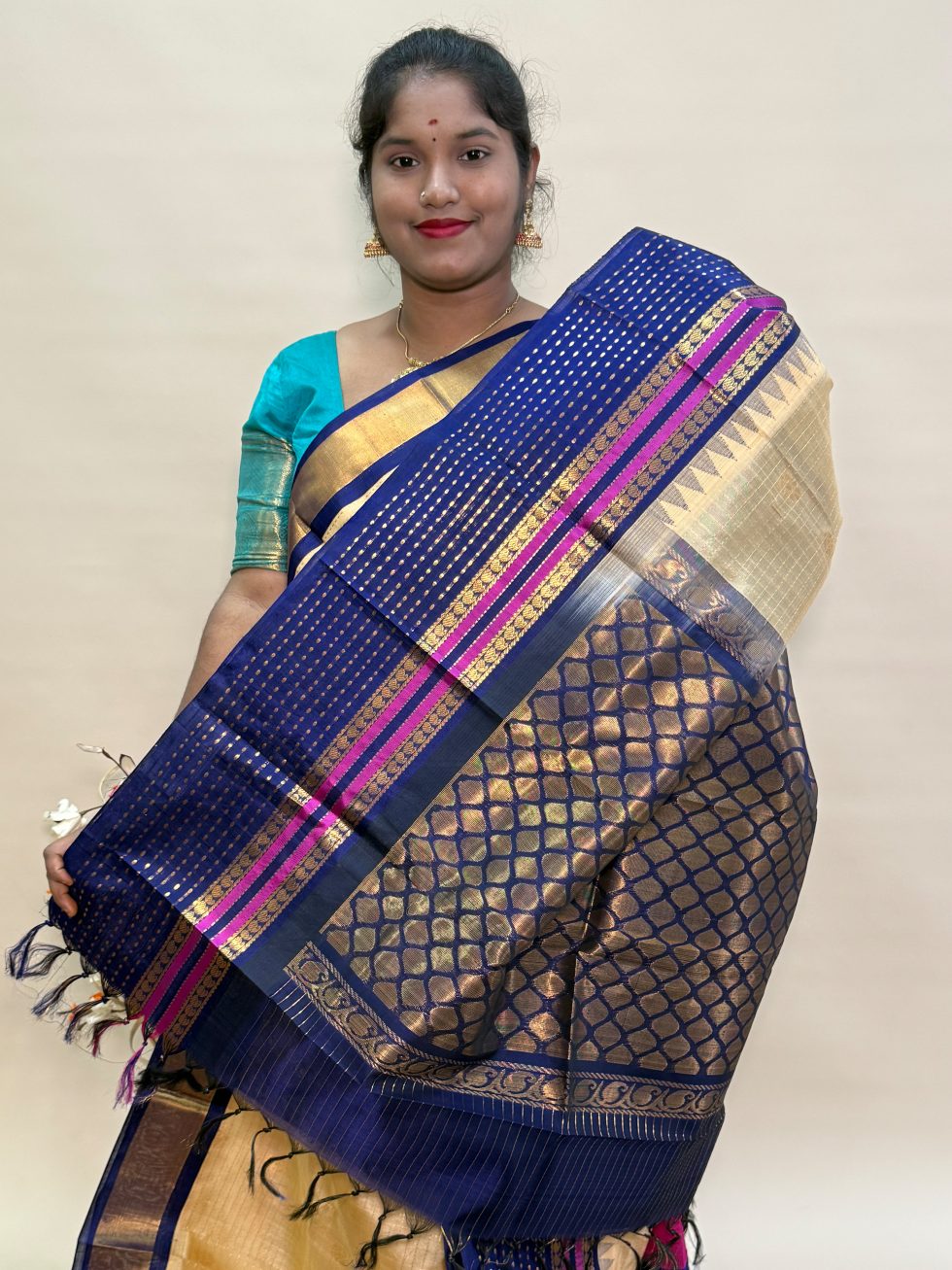 Silk Cotton Kuppadam Checked Buttas in Beige And Navy Blue With Traditional Border