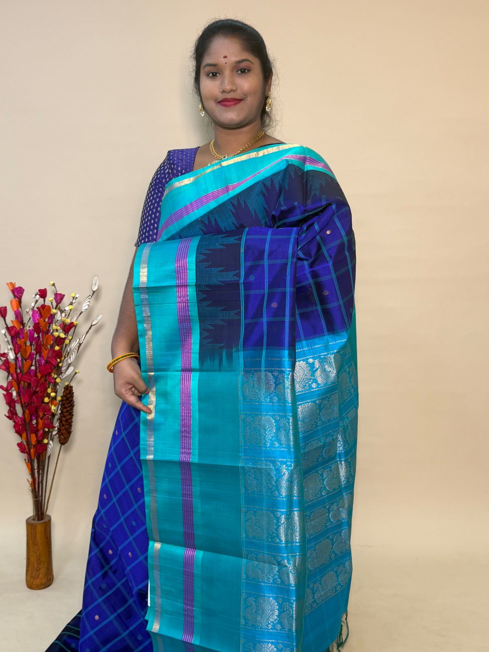Silk Cotton Kuppadam checked Buttas In Violet And Teal With Traditional Border