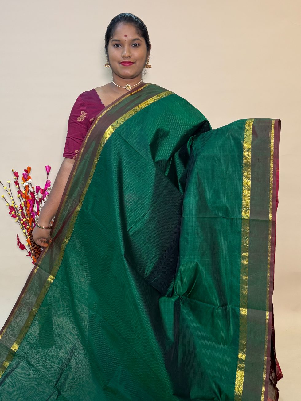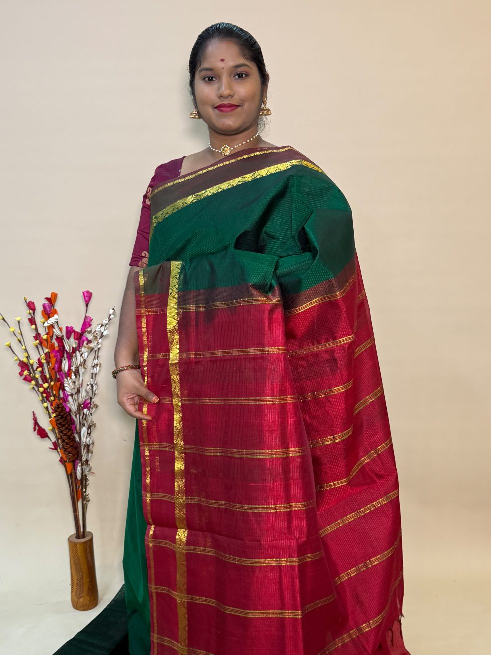 Simple Silk Cotton Saree in Green And Maroon With Traditional Border