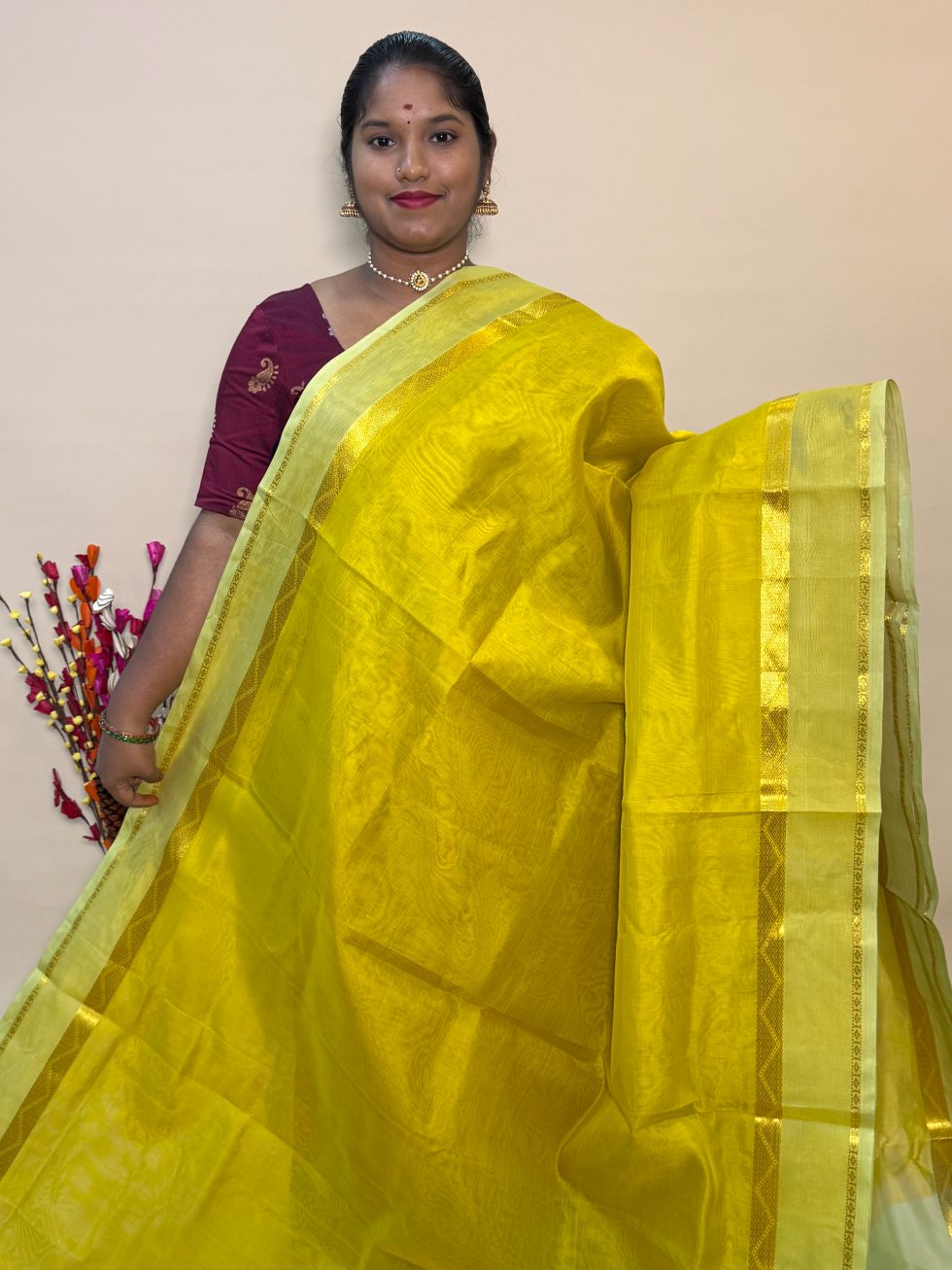 Simple Silk Cotton Saree in Lemon Yellow And Pastel Green With Traditional Border