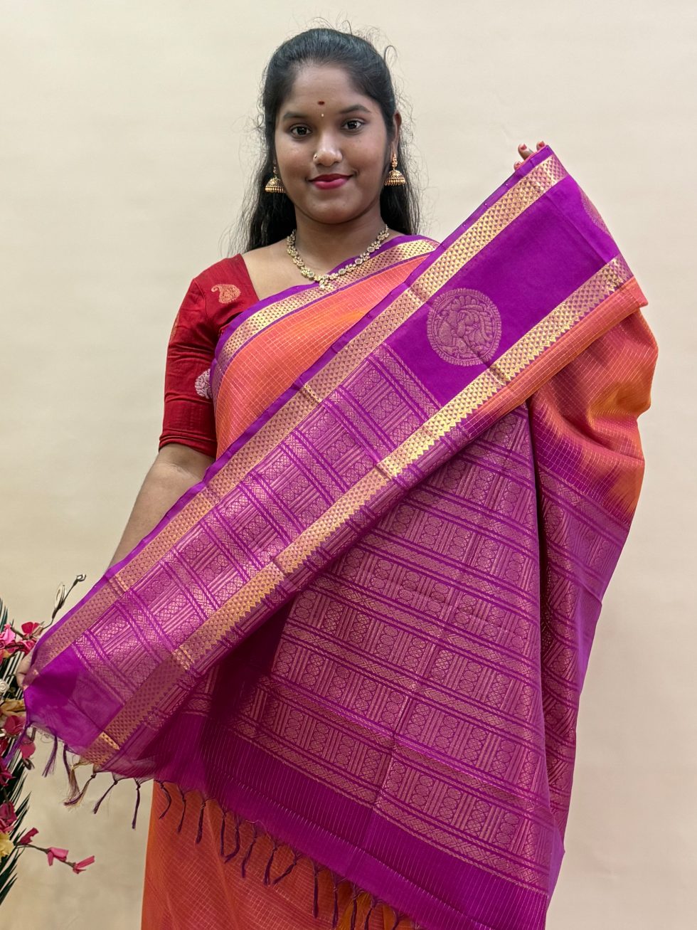 - Blouse : Attached (Contrast blouse as Pallu colour)