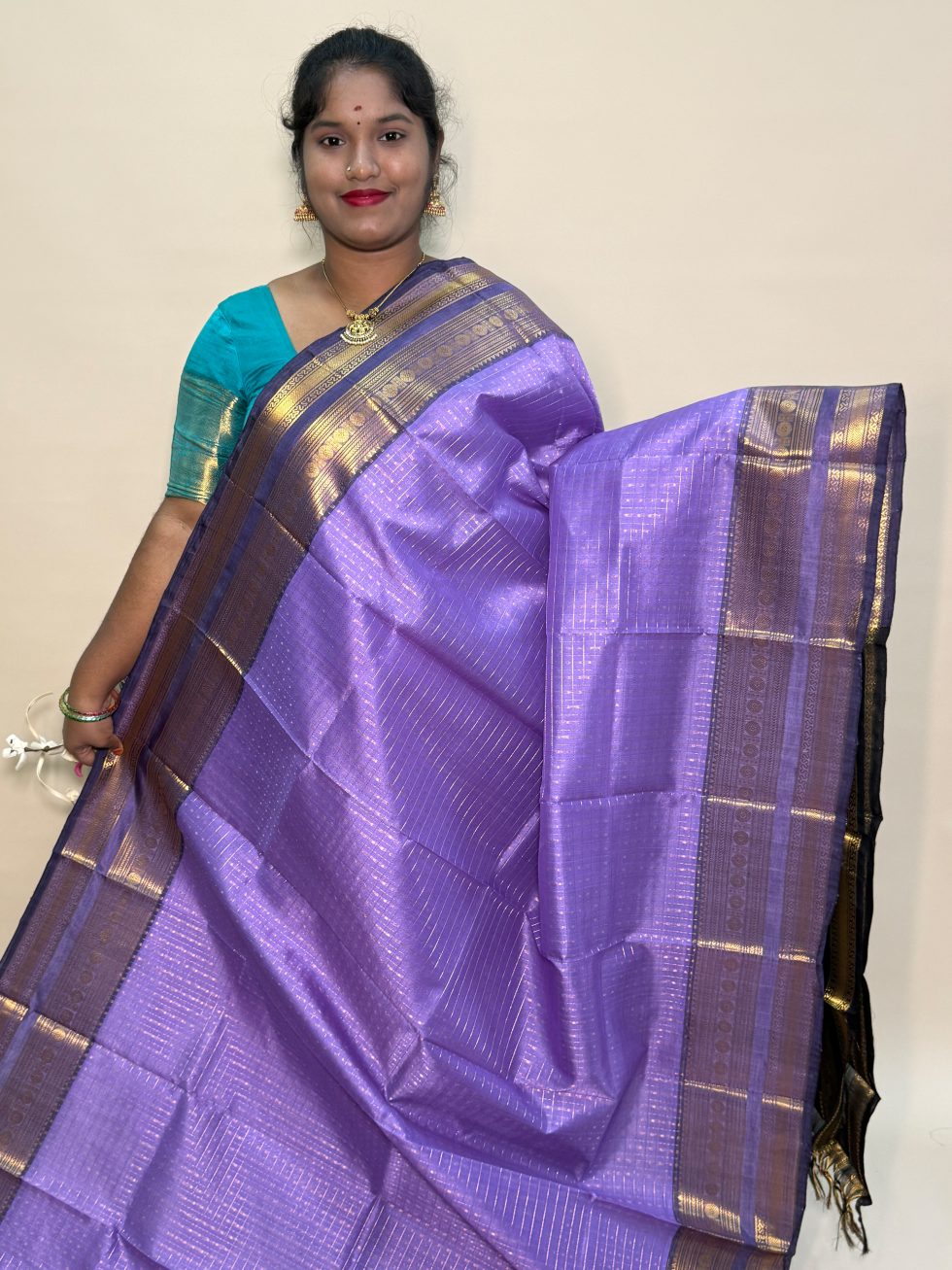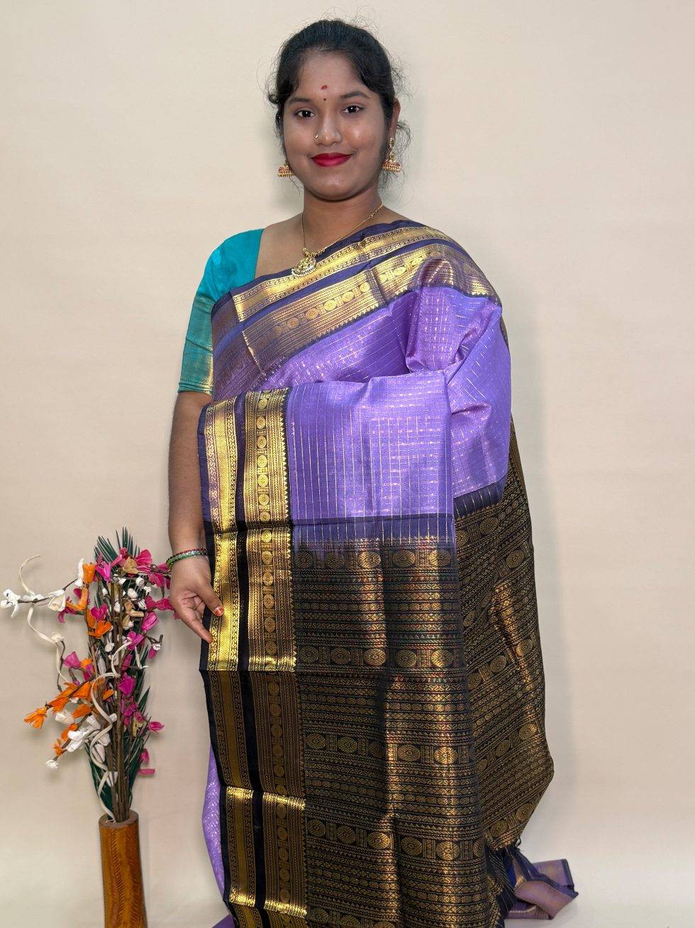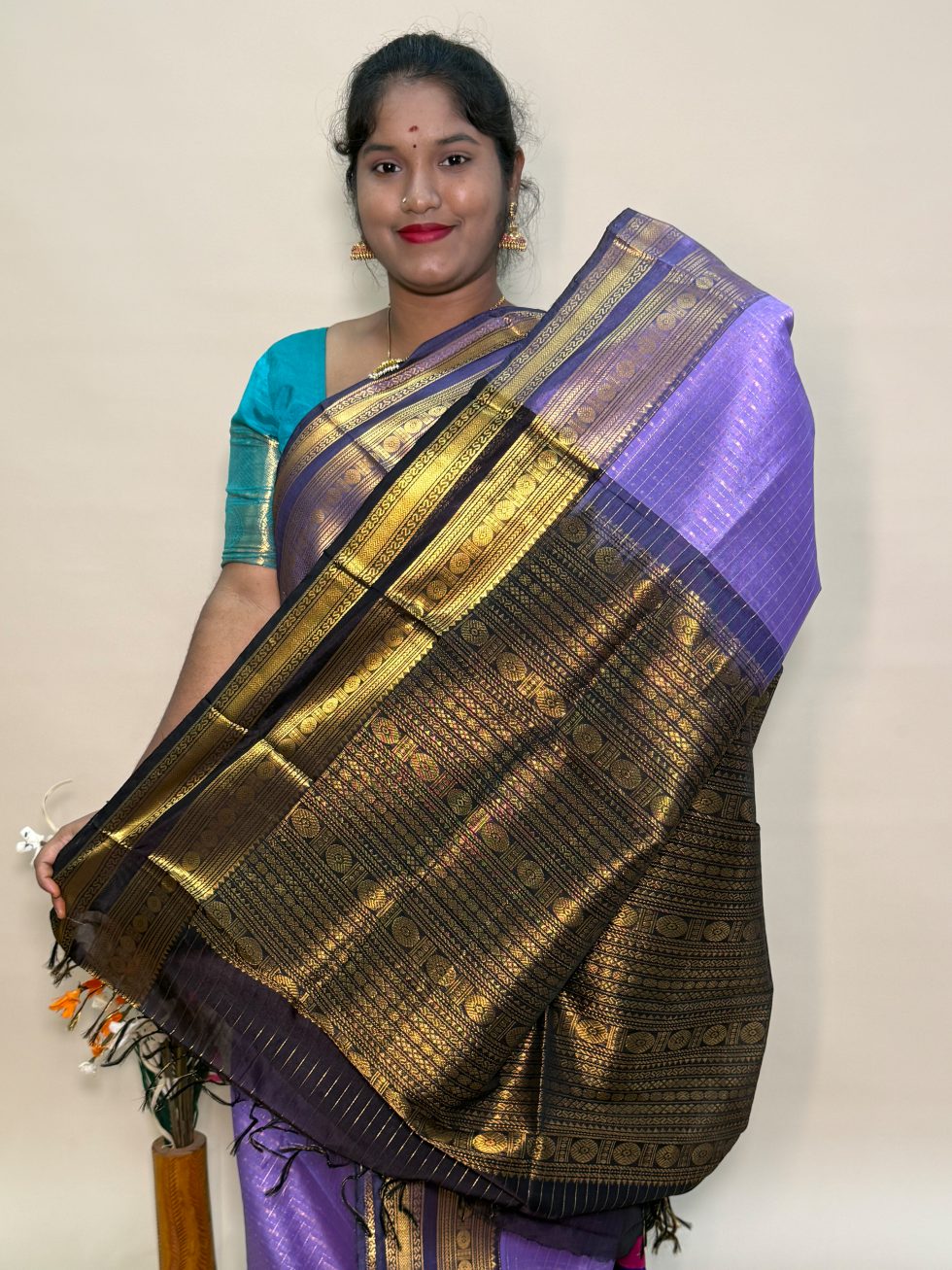 Traditional Silk Cotton Lakshadeepam Saree In Lavender And Coffee Brown With Traditional Border